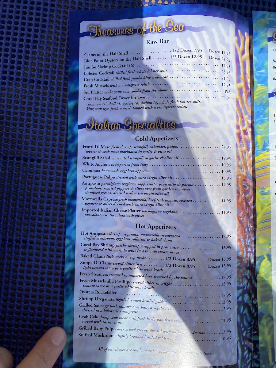 The menu at Coral Bay Cafe embraces a classic Italian dining experience with a focus on fresh, thoughtfully prepared seafood and traditional favorites. The offerings range from light, flavorful salads and pasta dishes to satisfying entrées featuring seafood and carefully selected meats. Visitors can find comforting options like Fusilli with red clam sauce or Scungilli over linguine in a hot sauce, alongside standout plates such as the Seafood Tower or Veal Saltimbocca.